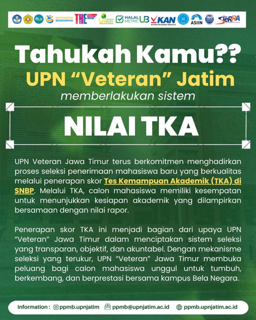 Tes Kemampuan Akademik digunakan sebagai salah satu instrumen penting dalam seleksi SNBP. Nilai TKA berfungsi sebagai validator terhadap nilai rapor peserta. Penggunaan TKA bertujuan untuk memastikan kesiapan akademik calon mahasiswa. Hasil TKA tidak menjadi satu-satunya indikator penilaian. Evaluasi tetap mempertimbangkan komponen akademik lain yang relevan. Pendekatan ini mendukung penilaian yang lebih komprehensif. Kualitas input mahasiswa menjadi perhatian utama institusi. Sistem seleksi dirancang untuk menghasilkan mahasiswa yang siap mengikuti proses pembelajaran.
