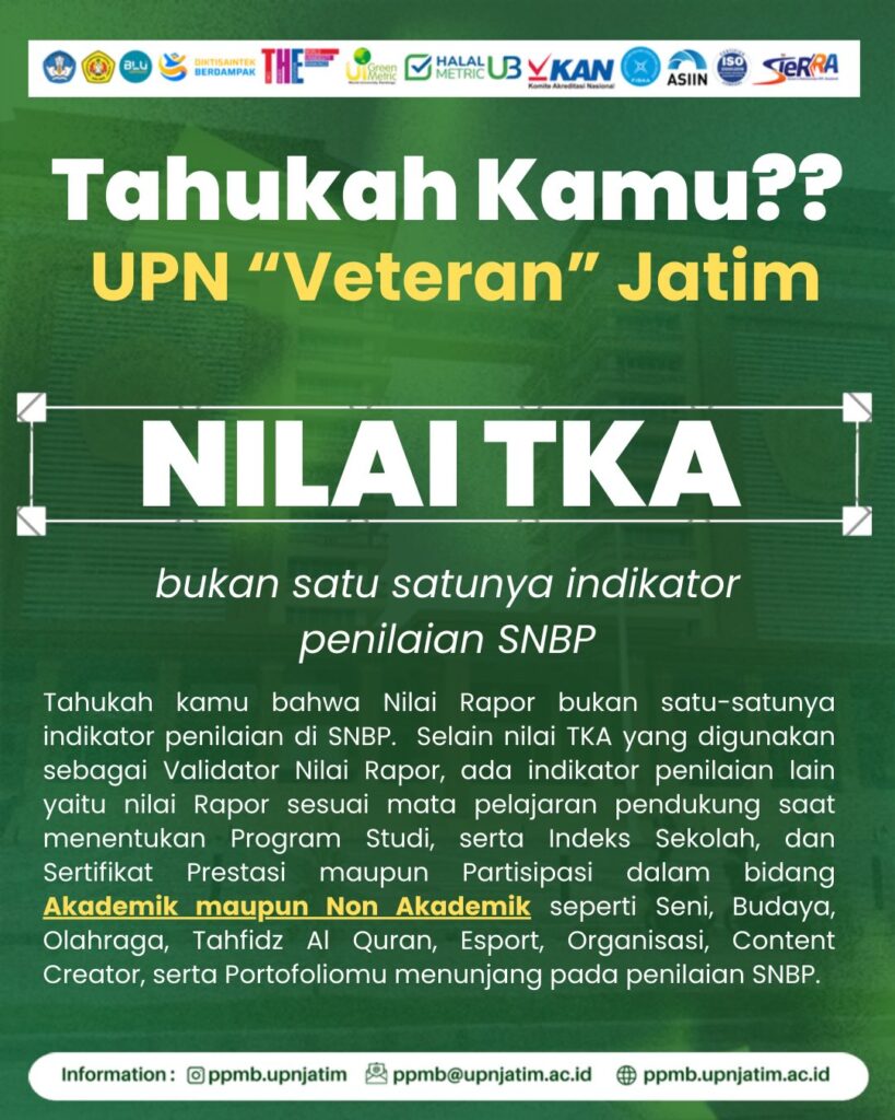 UPN “Veteran” Jawa Timur juga tidak menerapkan sistem passing grade dalam seleksi SNBP. Proses seleksi menggunakan sistem cut off yang disesuaikan dengan kuota setiap program studi. Peserta dengan peringkat nilai tertinggi akan dinyatakan lolos sesuai daya tampung yang tersedia. Penentuan kelulusan dilakukan secara objektif melalui pemeringkatan. Tidak terdapat nilai minimum yang ditetapkan secara tetap. Setiap program studi memiliki batas kelulusan yang dinamis. Mekanisme ini memungkinkan seleksi berjalan secara kompetitif. Sistem cut off dinilai lebih adaptif terhadap variasi kualitas peserta.